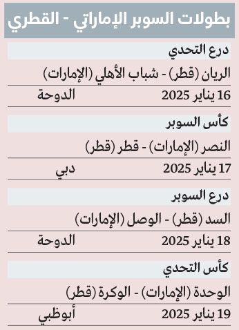 وفي 17 يناير يواجه النصر الإماراتي وصيف بطولة كأس رئيس الدولة فريق قطر وصيف كأس أمير قطر في بطولة كأس السوبر وتقام في دبي، أما درع السوبر فسيقام في الدوحة بمواجهة تجمع فريق الوصل بطل دوري أدنوك للمحترفين أمام السد حامل لقب دوري نجوم قطر.