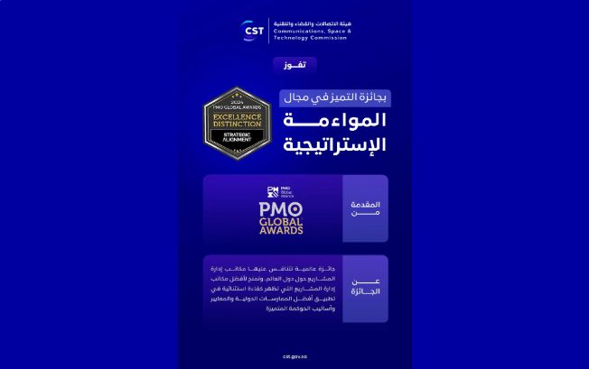فازت هيئة الاتصالات والفضاء والتقنية بجائزة التميز في مجال 'المواءمة الإستراتيجية' من معهد إدارة المشاريع العالمي والتحالف العالمي لإدارة المشاريع PMI-PMOGlobal. جاءت هذه الجائزة بعد منافسة شديدة مع أكثر من 75 جهة من مختلف أنحاء العالم، وذلك تقديرًا لدور الهيئة الريادي في تطبيق ممارسات وحوكمة المواءمة الإستراتيجية بين محفظة المشاريع وخطتها الإستراتيجية.