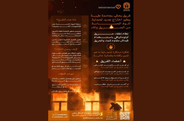 أعلنت جامعة طيبة بالمدينة المنورة عن تسجيل براءة اختراع نظام إطفاء أوتوماتيكي للحرائق، يعمل على إطفاء الحريق دون الإضرار بالمواد الحساسة للماء. النظام يعتمد على قماش مقاوم للماء والحريق، يتم تركيبه على شكل ستائر إلكترونية 'Roller' تنسدل في حال نشوب حريق لتغطية الأرفف وحمايتها من الضرر.