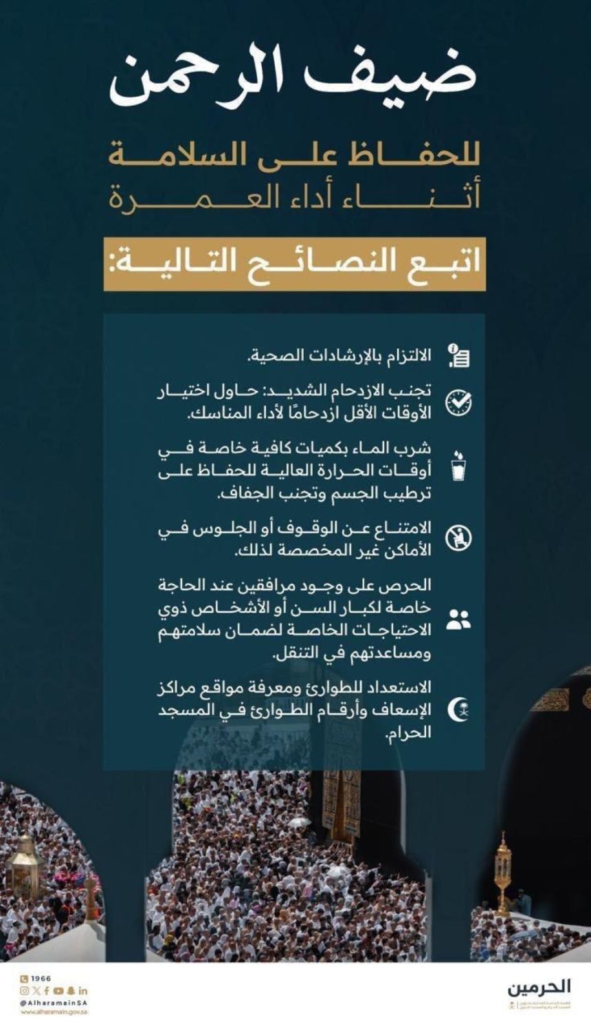 نشرت الهيئة العامة للعناية بشؤون الحرمين عددًا من الإرشادات المهمة، للحفاظ على السلامة في أثناء أداء العمرة.