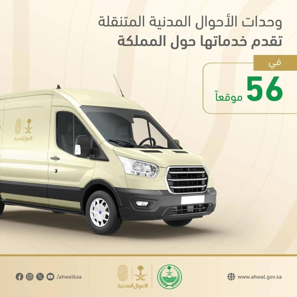 تُقدم الوحدات المتنقلة للأحوال المدنية خدماتها للرجال والنساء في 56 موقعاً حول المملكة، وذلك ضمن مبادرة «نأتي إليك» التي تنفذها وكالة وزارة الداخلية للأحوال المدنية للجهات الحكومية والخاصة، ومبادرة «موجودين» الموجهة لخدمة المحافظات والمراكز والقرى البعيدة عن مكاتب الأحوال المدنية.