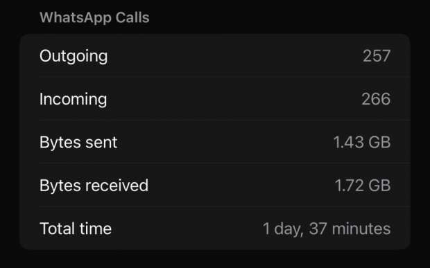 وبحسب الصحيفة البريطانية، فستعرض صفحة إحصائيات WhatsApp أيضا معلومات حول مكالماتك الهاتفية التي أجريتها من خلال التطبيق، ويمكنك رؤية عدد المكالمات الصادرة والواردة ومقدار البيانات التي استخدموها، كما يمكنك التحقق من إجمالي الوقت الذي أمضيته في مكالمات WhatsApp الهاتفية، إذا كنت تستخدمه بانتظام، فقد يتم احتسابه بـ الأيام.