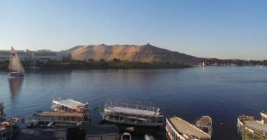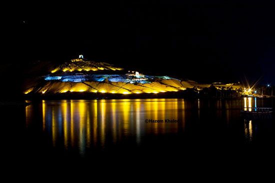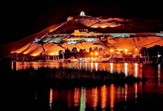مشهد ساحر إضاءة جبل أبو الهوا فى مدينة أسوان أمام النيل
