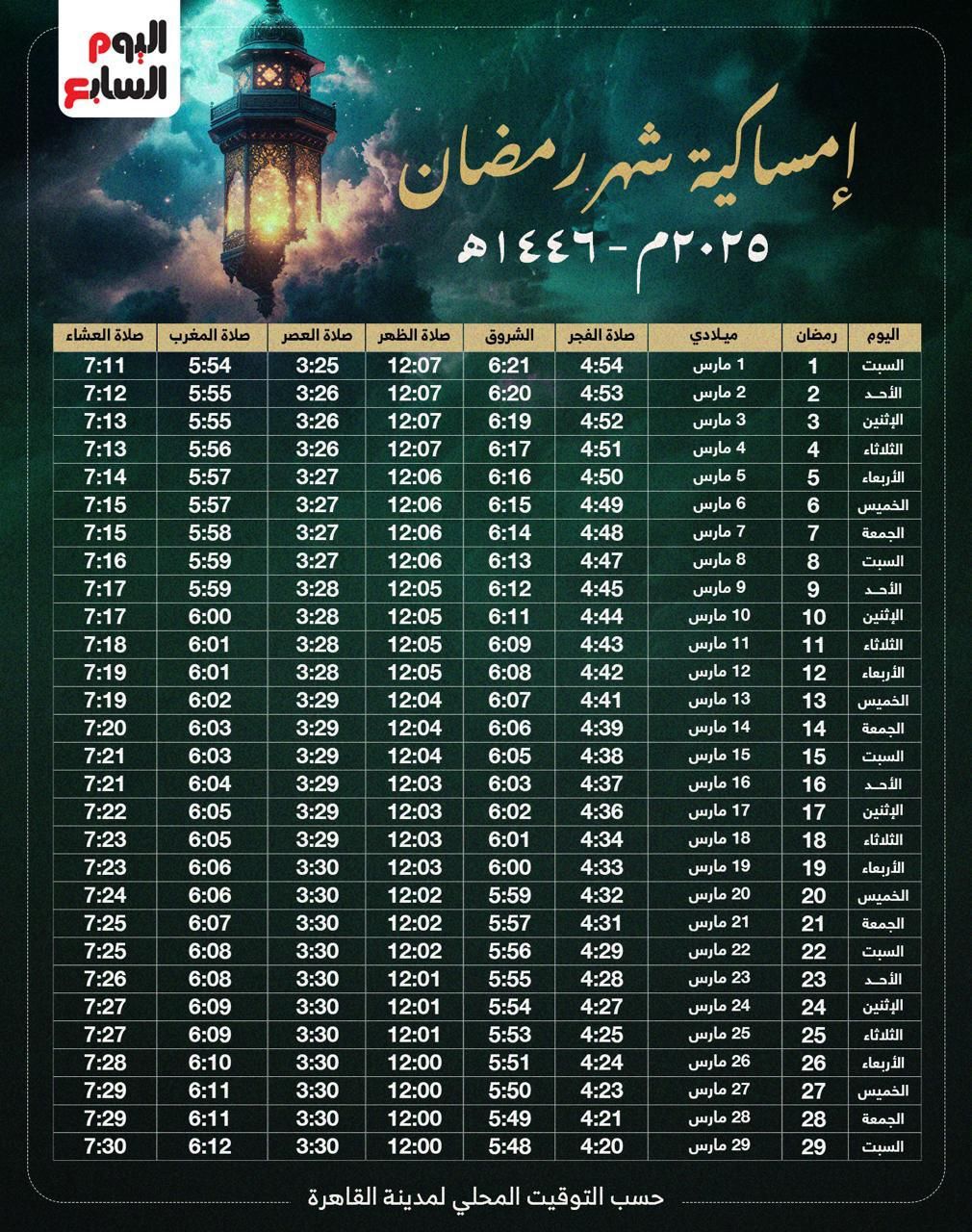 وينشر "اليوم السابع" إمساكية شهر رمضان المعظم لعام 1446 هجريا الموافق 2025 ميلاديا، لمدينة القاهرة ، وفقا للحسابات الفلكية التى أعدها معهد الفلك ، وعلى المقيمين خارجها مراعاة فروق التوقيت.