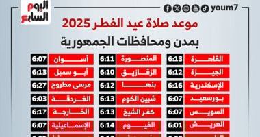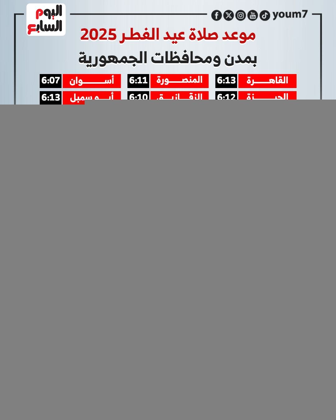 ويقدم "اليوم السابع" لقرائه موعد صلاة عيد الفطر المبارك 2025، في محافظات ومدن جمهورية مصر العربية، وذلك وفقا للحسابات الفلكية التى أعدها معمل أبحاث الشمس بالمعهد القومى للبحوث الفلكية، كما يلى: