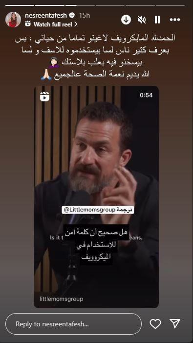 ونشرت نسرين طافش فيديو يكشف مخاطر استخدامه، عبر خاصية ستورى على حسابها على إنستجرام، وكتبت: "الحمد الله الميكرويف لاغيتو تماما من حياتى بس بعرف كتير ناس لسه بيستخدموه للأسف ولسه بيسخنوا فيه علب بلاستيك الله، يديم نعمة الصحة على الجميع".