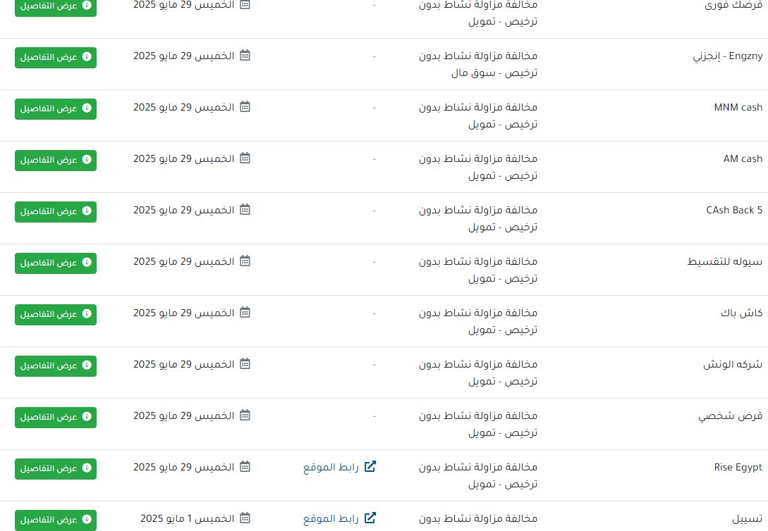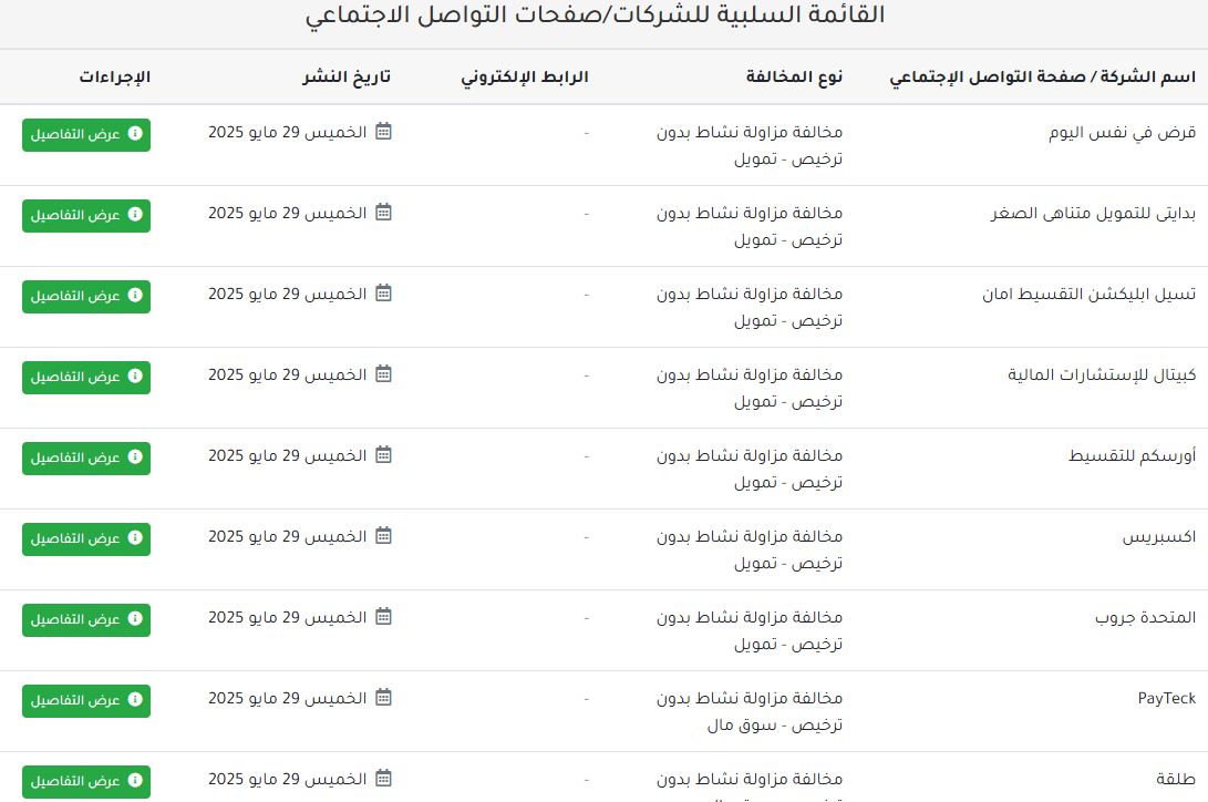 الجمعة، 30 مايو 2025 02:55 مأعلنت هيئة الرقابة المالية، عن قائمة بالجهات السلبية التي تم رصدها بناءً على الشكاوى الواردة للهيئة، والتي تبين أنها تباشر أنشطة مالية غير مصرفية بالمخالفة لأحكام القوانين والقواعد المنظمة للخدمات المالية غير المصرفية، مع الأخذ في الاعتبار أن هذه القائمة السلبية سيتم تحديثها بشكل دوري في ضوء المستجدات.