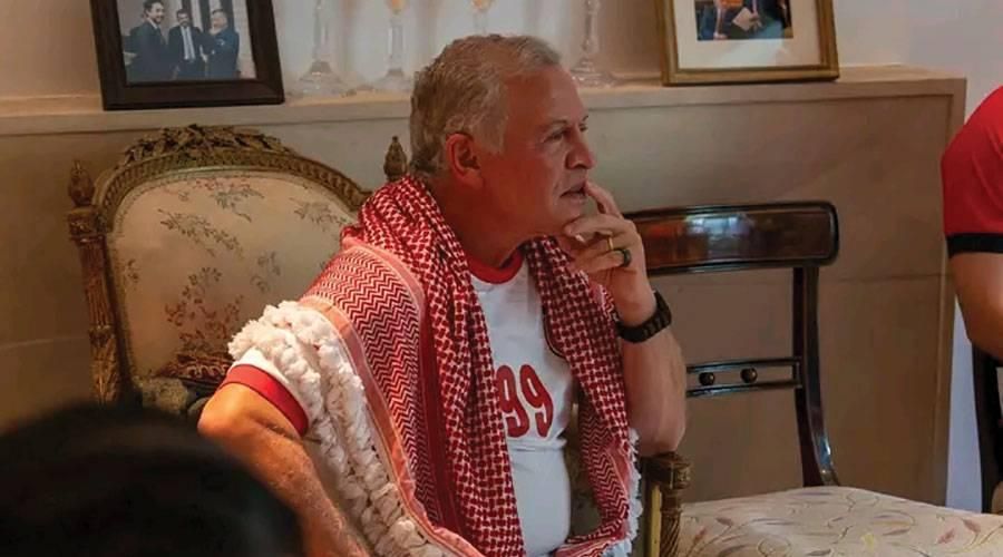 وظهر الملك عبد الله مرتدياً قميص المنتخب وعلى كتفية الكوفية الحمراء ذات الدلالة الوطنية التاريخية والتراثية الأردنية وسط مجموعة من طاقم سفارة عمّان في لندن.