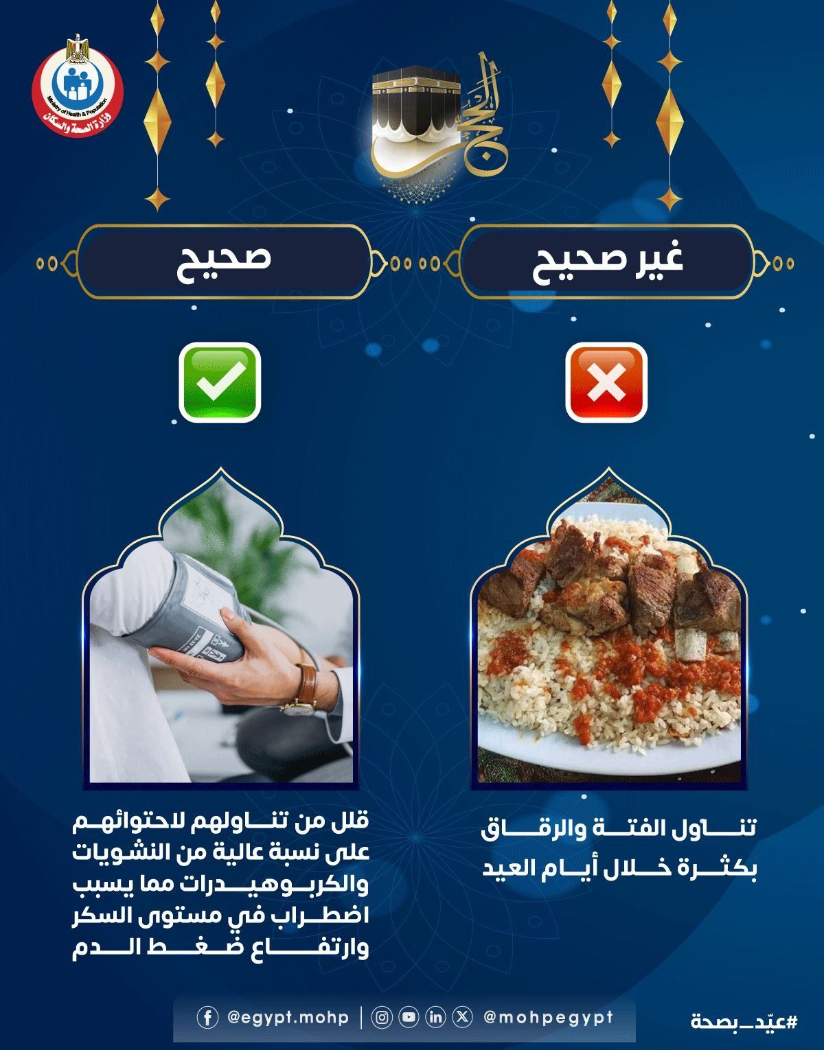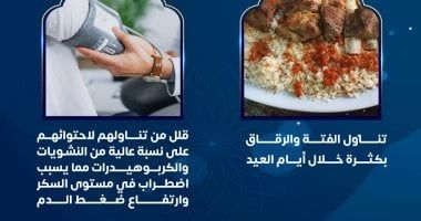 السبت، 07 يونيو 2025 09:12 موجهت وزارة الصحة نصيحة مهمة حول أكل الفتة، قالت فيها: لصحتك.. قلل من تناول الفتة والرقاق بكثرة خلال العيد لتحمي نفسك من اضطراب مستوى السكر وارتفاع ضغط الدم.