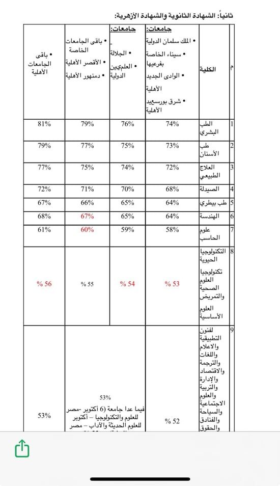 وأضاف المتحدث الرسمي أن الاجتماع المشترك لمجلسي الجامعات الخاصة والأهلية انتهى إلى تحديد الحدود الدنيا للتقدم للكليات بالجامعات الخاصة والأهلية ، وذلك لطلاب شهادة الثانوية العامة وما يعادلها من شهادات عربية وأجنبية للعام الجامعي 2025/2026، وجاءت على النحو التالي: