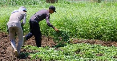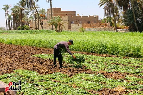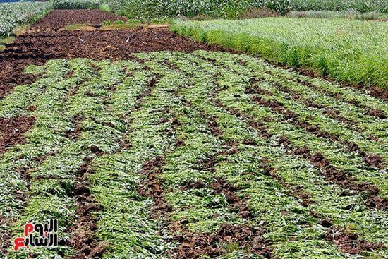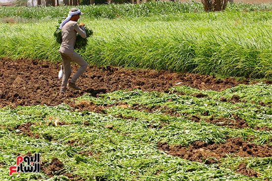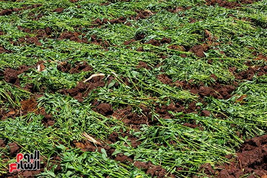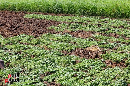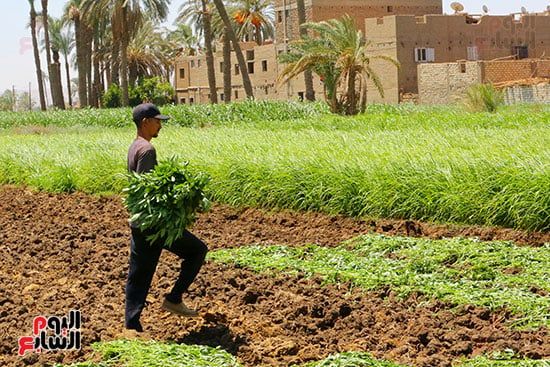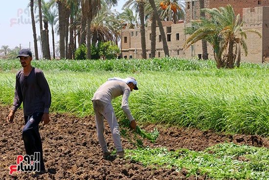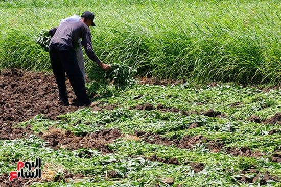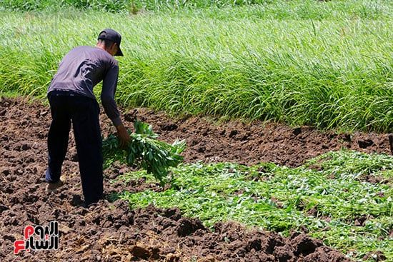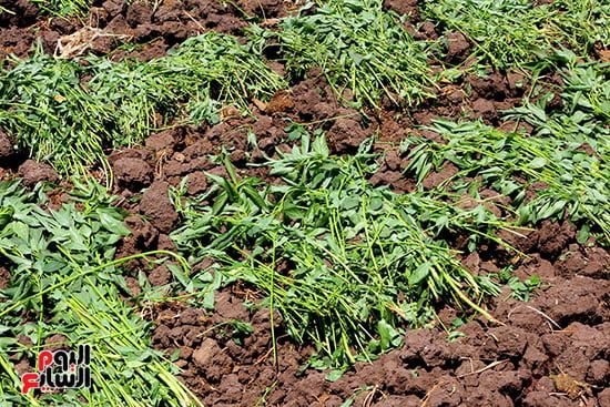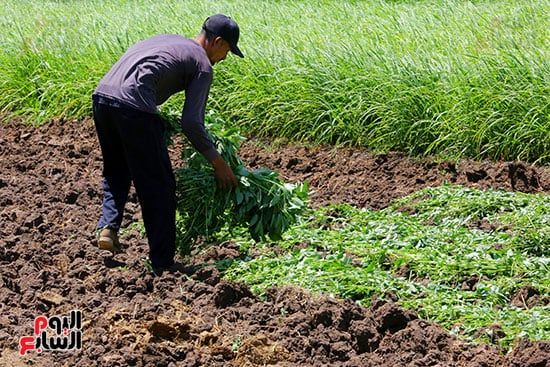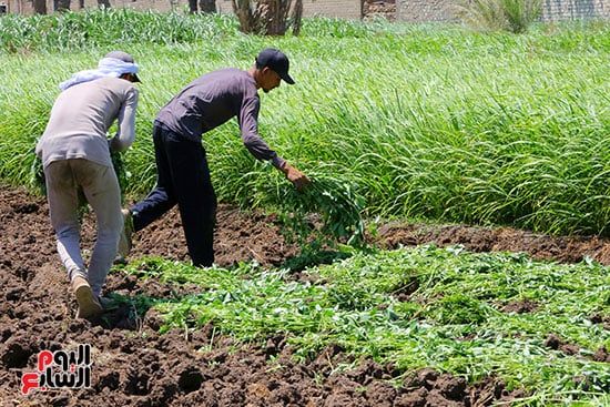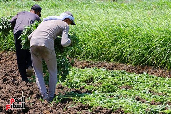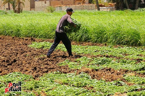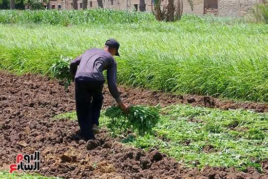 حصاد الملوخية وفرشها على الأرض الزراعية على شكل حُزم