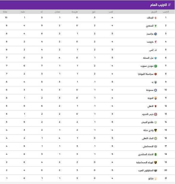 وبعد تلك النتائج يواصل الزمالك التربع على عرش جدول ترتيب الدورى، فيما قفز بيراميدز للمركز الثالث وتواجد الأهلى فى المركز الخامس برصيد 5 نقاط فقط، وجاء جدول ترتيب الدورى كالتالى..