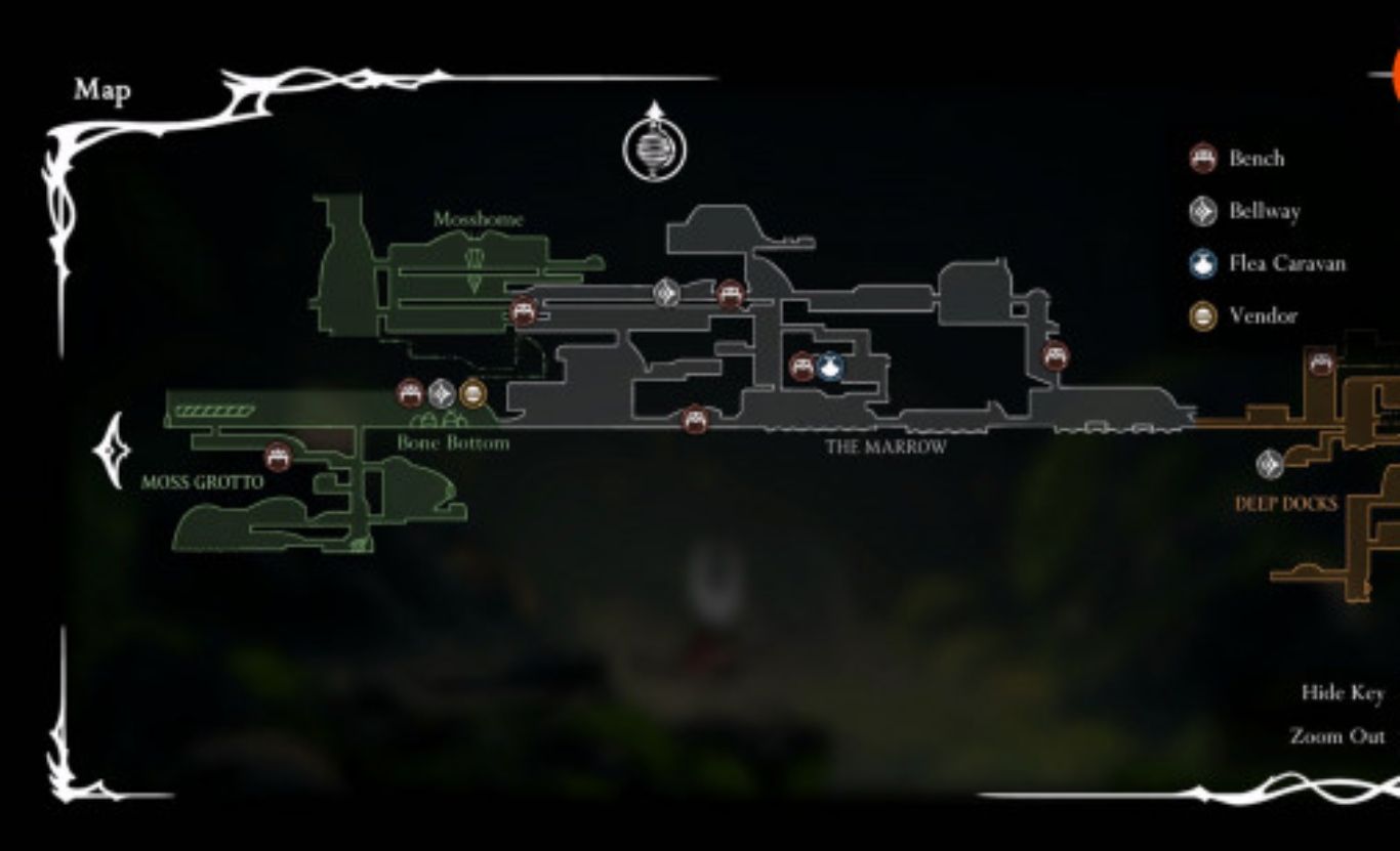 من أكثر الأمور التي تجعل تجربة Hollow Knight: Silksong مربكة في بدايتها هو غياب نظام الخريطة إذ تبدأ رحلتك في Pharloom دون أي وسيلة لمعرفة تفاصيل البيئة المحيطة أو رصد المسارات التي مررت بها وهذا يزيد من صعوبة الاستكشاف لكن هذا الوضع يتغير بمجرد أن تغادر منطقة Moss Grotto وتكمل طريقك عبر The Marrow فهناك ستجد التاجر Shakra وهو شخصية محورية في اللعبة يعمل كملاح ورسّام خرائط ويقوم ببيع الخرائط وأدوات رسم الخرائط التي تُعتبر أساسية لرحلتك