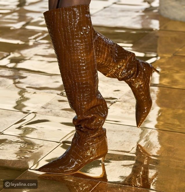 تسيطر الأحذية التي تصل إلى الفخذين على عروض الأزياء لهذا الموسم، إذ تعكس جرأة لافتة وتمنح مظهراً درامياً يتناسب مع الفساتين القصيرة أو الشورتات الشتوية.