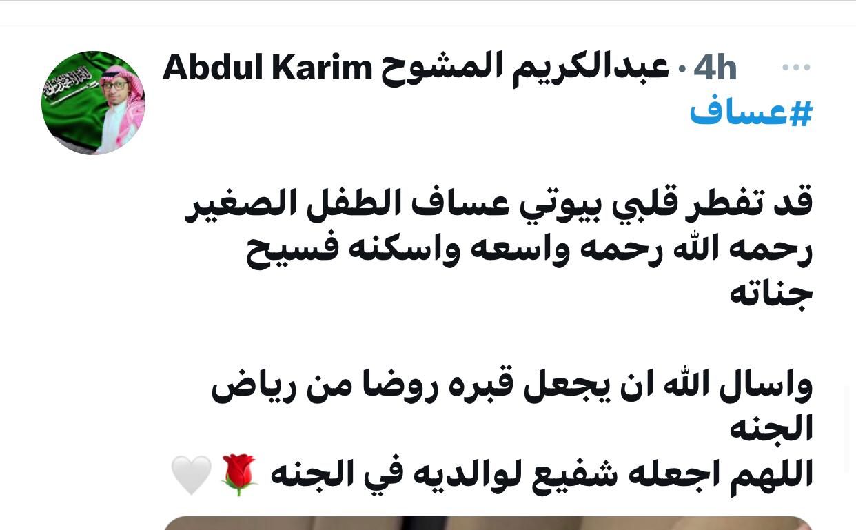 انتقل إلى رحمة الله ولدي عساف اسأل الله أن يجعله شفيعاً لوالديه وأن يجعله طيراً من طيور الجنة ويجبر قلوبنا جبراً تعجب منه أهل السماوات والأرض."