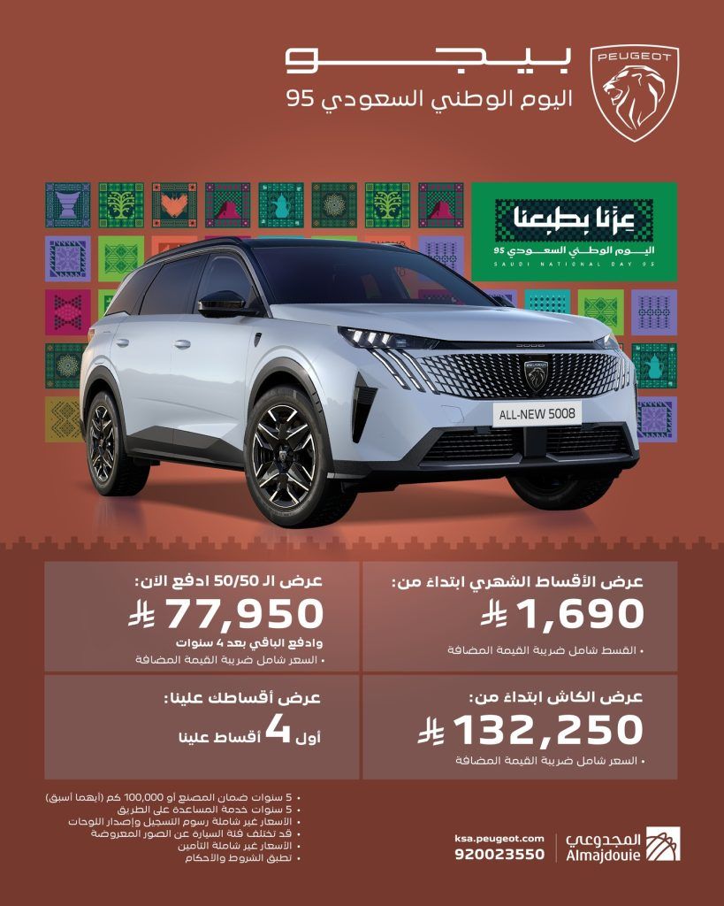 - بيجو 5008 – عرض الكاش ابتداءً من: 132,250 ريال – الأقساط الشهري : 1,690 ريال