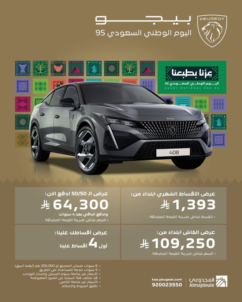 - بيجو 408 – عرض الكاش ابتداء من: 109,250 ريال – الأقساط الشهري : 1,393 ريال