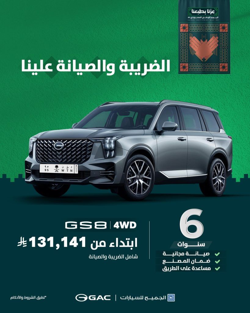 - GS8 4WD ابتداءً من 131,141 ريال (شامل الضريبة والصيانة)