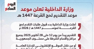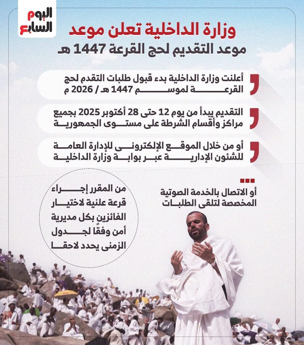 الأربعاء، 08 أكتوبر 2025 01:00 صأعلنت وزارة الداخلية بدء قبول طلبات التقدم لحج القرعة لموسم 1447 هـ / 2026 م، اعتبارًا من يوم الأحد 12 أكتوبر 2025، وحتى الثلاثاء 28 أكتوبر 2025، وذلك بجميع مراكز وأقسام الشرطة على مستوى الجمهورية، أو من خلال الموقع الإلكتروني للإدارة العامة للشئون الإدارية عبر بوابة وزارة الداخلية، أو الاتصال بالخدمة الصوتية المخصصة لتلقي الطلبات. ومن المقرر إجراء قرعة علنية لاختيار الفائزين بكل مديرية أمن من خلال البوابة المصرية الموحدة للحج، وفقًا للجدول الزمني الذي ستحدده الإدارة العامة للشئون الإدارية لاحقًا.