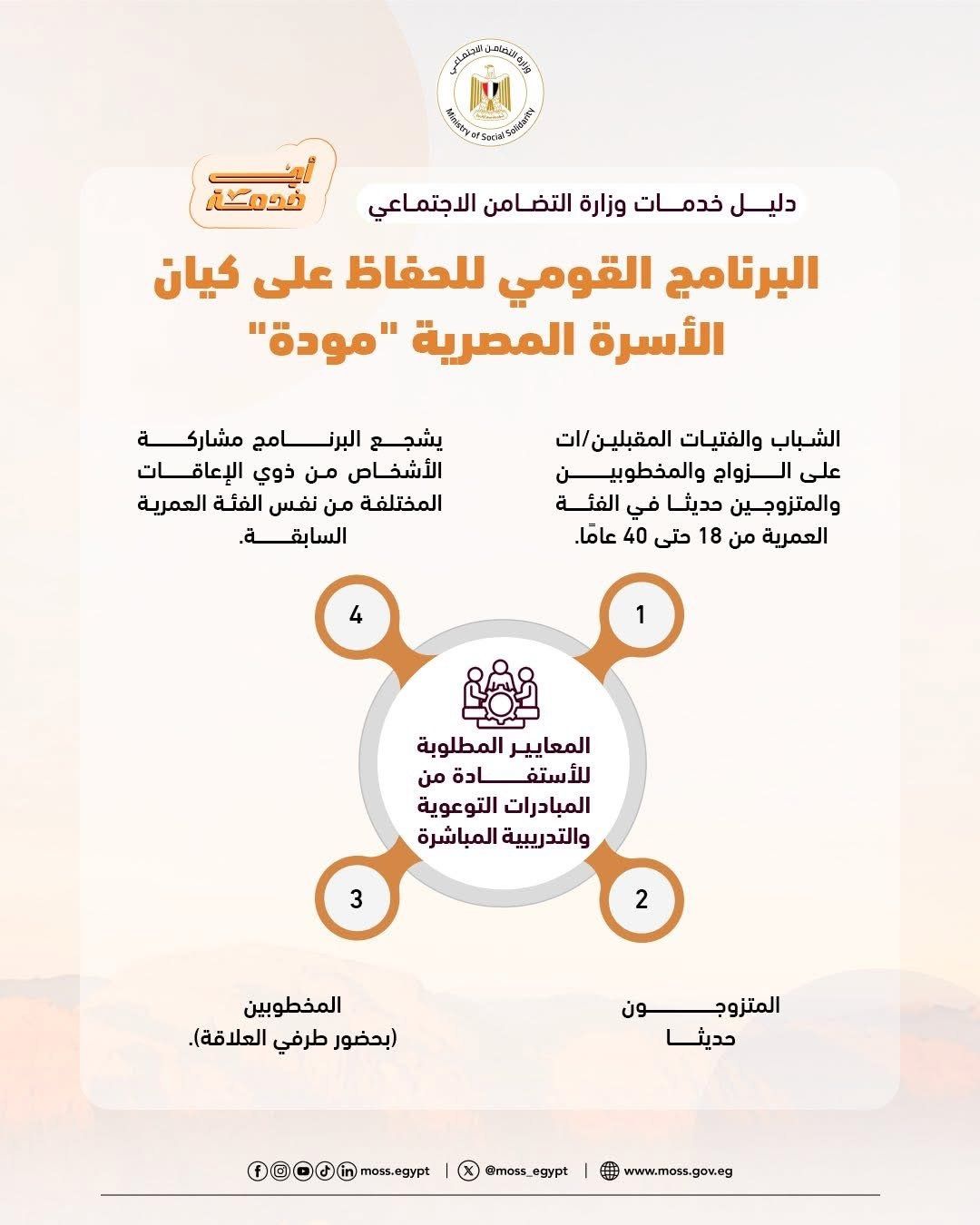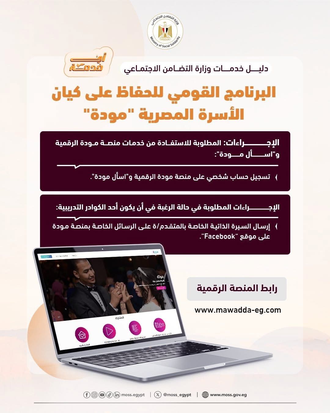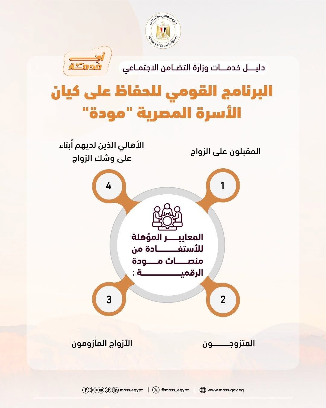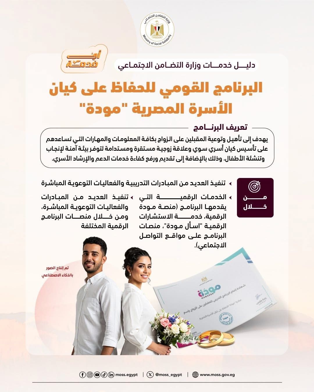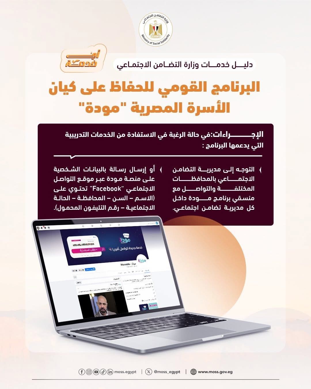 نشرت وزارة التضامن الاجتماعي انفو جراف صمن سلسلة خدمات والوزارة تحت عنوان "أى خدمة" للتعريف بخدمات الوزارة وشروط الاستفادة منها، حيث أشارت إلى خدمات البرنامج القومى للحفاظ على كيان الأسرة المصرية "مودة".