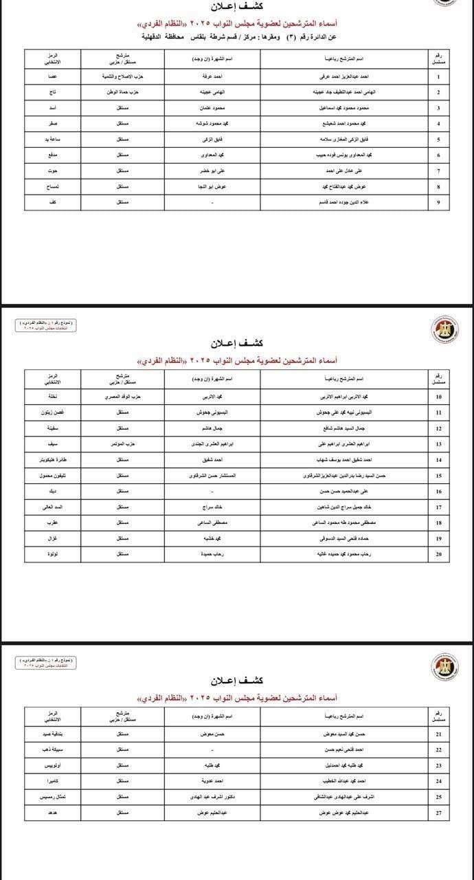 الخميس، 16 أكتوبر 2025 11:43 مأعلنت الهيئة الوطنية للانتخابات، أسماء المرشحين المبدئية علي النظام الفردي عن الدائرة الثالثة بمحافظة الدقهلية لانتخابات مجلس النواب 2025، والتي جاءت كالتالي: