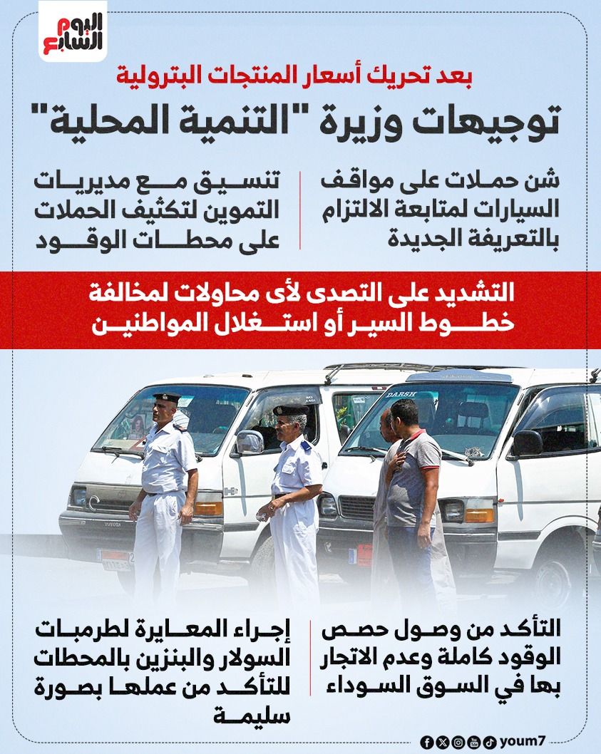 بعد قرار لجنة التسعير التلقائي للمنتجات البترولية بزيادة أسعار البنزين والسولار اعتباراً من اليوم، أصدرت الدكتورة منال عوض وزيرة التنمية المحلية عدة توجيهات للمحافظين بخصوص الإجراءات الواجب تخاذها بعد تحديد أسعار تعريفة الركوب الجديدة لجميع المواصلات العامة الخطوط الداخلية والخارجية (سيارات الميكروباص والسرفيس والنقل الجماعي).