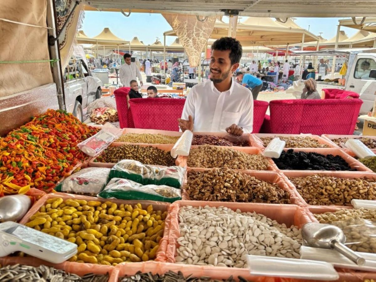 البائع سالم الحويطي يستعرض المكسرات التي تشهد إقبالاً كبيراً من الأهالي والمقيمين في سوق السبت بتبوك. (تصوير: علي بدير)