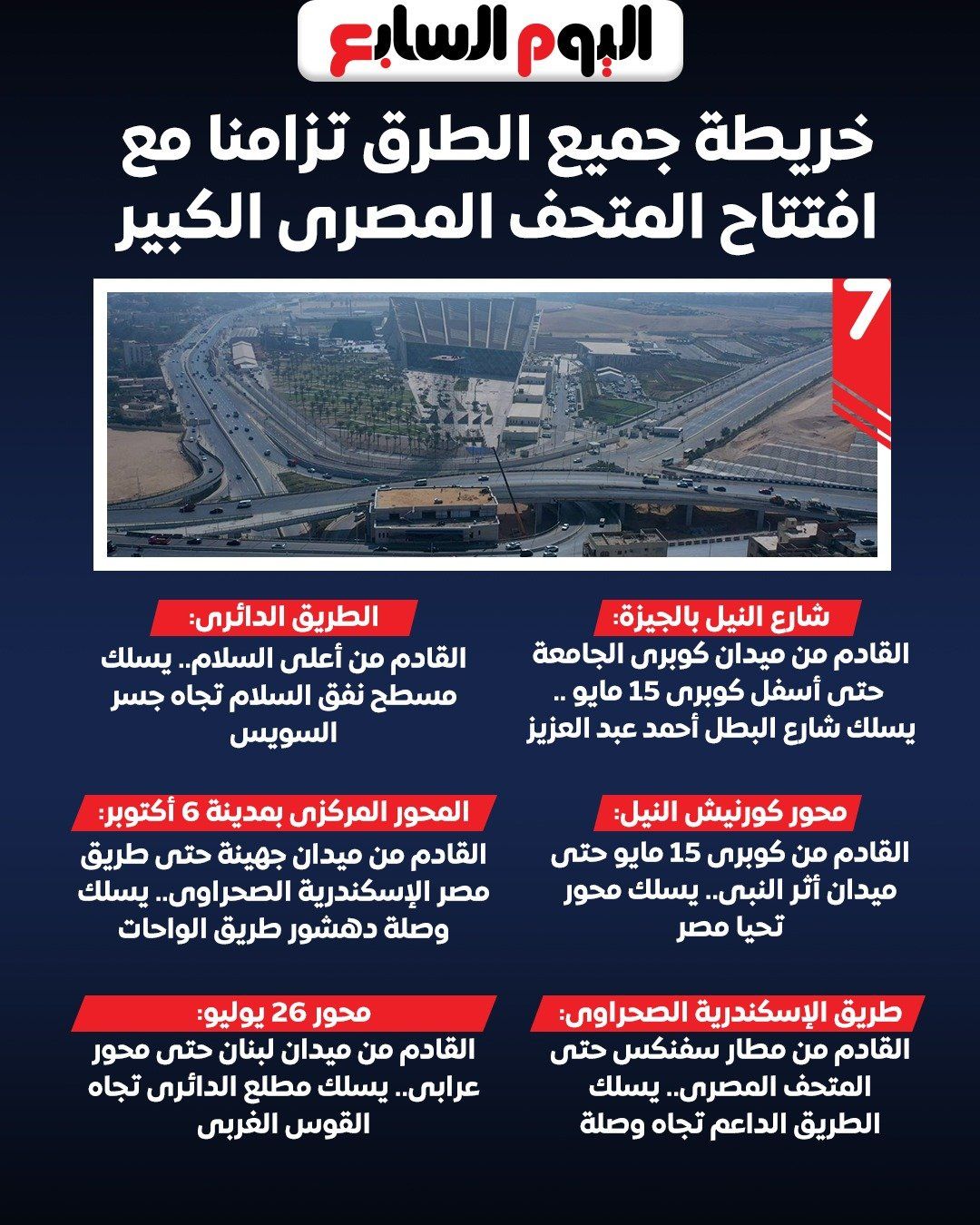 وتنشر "اليوم السابع" تفاصيل خريطة الطرق والتحويلات المرورية الجديدة التي سيتم تطبيقها بدءًا من صباح السبت، بهدف تحقيق أكبر قدر من السيولة المرورية في نطاق محافظة الجيزة والمناطق المؤدية إلى المتحف، خاصة مع تزايد حركة الوفود الرسمية والسياح والإعلاميين القادمين لتغطية الاحتفالية الكبرى.