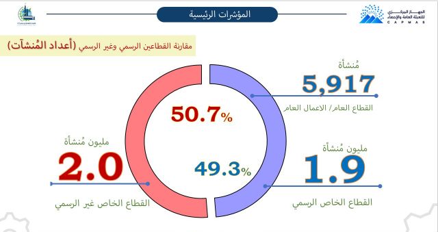 القطاع الرسمي استحوذ على 72.7% من نسب التشغيلوتشير بيانات التعداد الاقتصادي لعام 2023 إلى أن القطاع الرسمي استحوذ على 72.7% من نسب التشغيل، مقابل 27.3% للقطاع غير الرسمي، كما استحوذ القطاع الخاص الرسمي على 91.7% من إجمالي الأجور المدفوعة خلال فترة التعداد، مقابل 8.3% للقطاع غير الرسمي، أما على مستوى الإنتاج فقد استحوذ القطاع الرسمي على 92.3% من الإجمالي، مقابل 7.7% للقطاع غير الرسمي.