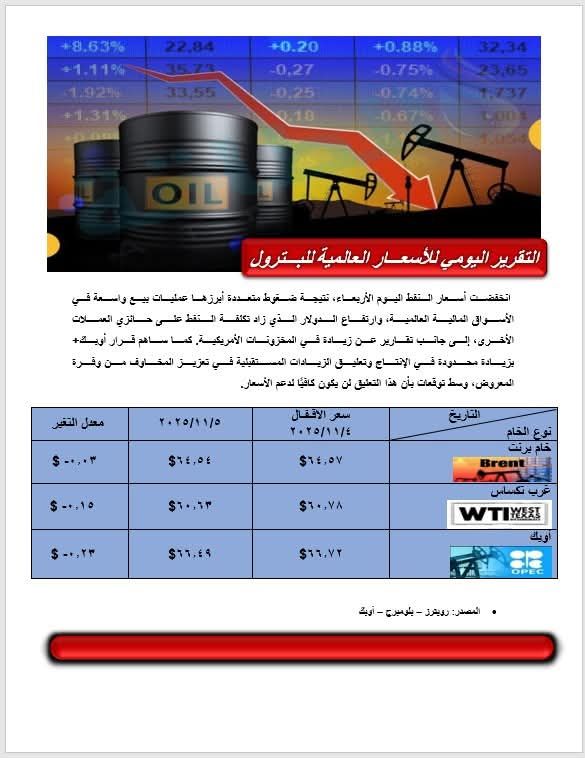 الأربعاء، 05 نوفمبر 2025 12:08 منشرت الهيئة المصرية العامة للبترول على صفحتها بمواقع التواصل الاجتماعى الأسعار العالمية للبترول اليوم الإثنين الموافق 5-11-2025.