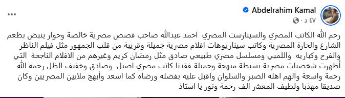 وقال كمال، عبر حسابه على فيس بوك: رحم الله الكاتب والسينارست المصري أحمد عبد الله، صاحب قصص مصرية خالصة وحوار ينبض بطعم الشارع والحارة المصرية وكاتب سيناريوهات أفلام مصرية جميلة وقريبة من قلب الجمهور مثل فيلم الناظر والفرح وكباريه واللمبي ومسلسل مصري طبيعي صادق مثل رمضان كريم وغيرهم من الأفلام الناجحة التي أظهرت شخصيات مصرية بسيطة مبهجة وجميلة.