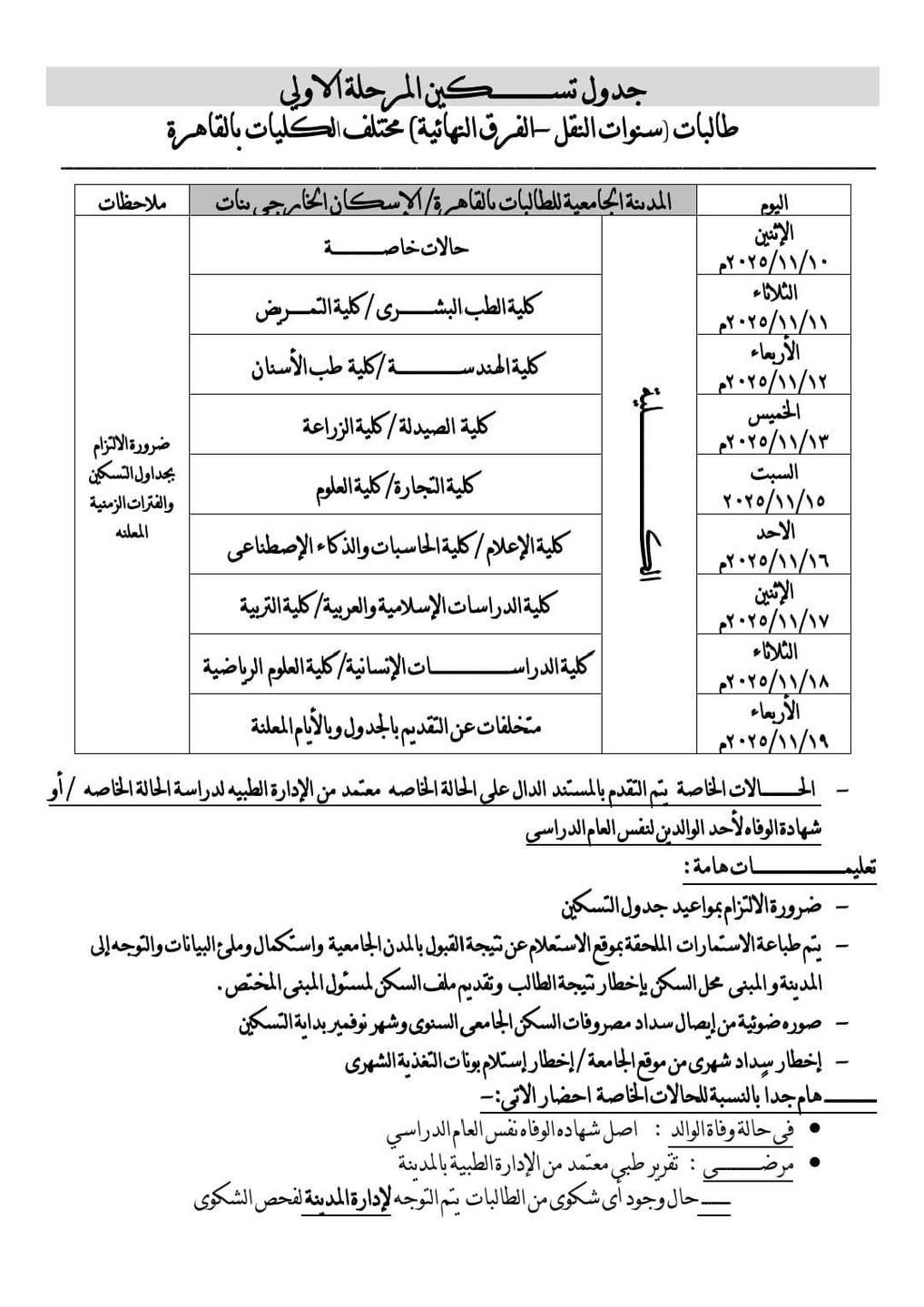 هـ . بالنسبة للطلاب وطلبة الحالات الخاصة التقدم الي الإدارات العامة للمدن الجامعية للطلاب والطالبات إعتبارا من يوم السبت ٢٠٢٥/١١/٨م لتوقيع الكشف الطبى ، وإحضار المستندات الدالة على الحالة (وفاة والد بنفس العام الدراسي / مرض مزمن ... إلخ) للمراجعة واستكمال إجراءات التسكين لطلاب وطلبات الحالات الخاصة.
