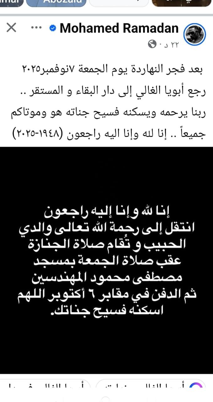 وكتب الفنان محمد رمضان على صفحته، "انتقل إلى رحمة الله تعالى والدي الحبيب، وستقام صلاة الجنازة عقب صلاة الجمعة بمسجد مصطفى محمود المهندسين، ثم الدفن بمقابر العائلة في 6 أكتوبر".