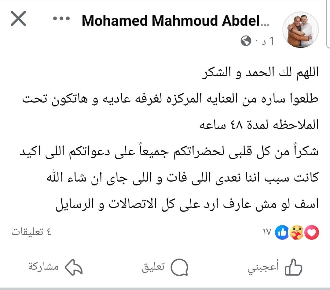 طمأن الفنان محمد محمود عبد العزيز جمهوره على حالة زوجته وعلق قائلا على "فيس بوك": اللهم لك الحمد والشكر طلعوا سارة من العناية المركزة لغرفة عادية وهاتكون تحت الملاحظة لمدة 48 ساعة، شكراً من كل قلبى لحضراتكم جميعاً على دعواتكم اللى أكيد كانت سبب إننا نعدى اللى فات واللى جاى إن شاء الله، آسف لو مش عارف ارد على كل الاتصالات والرسايل.