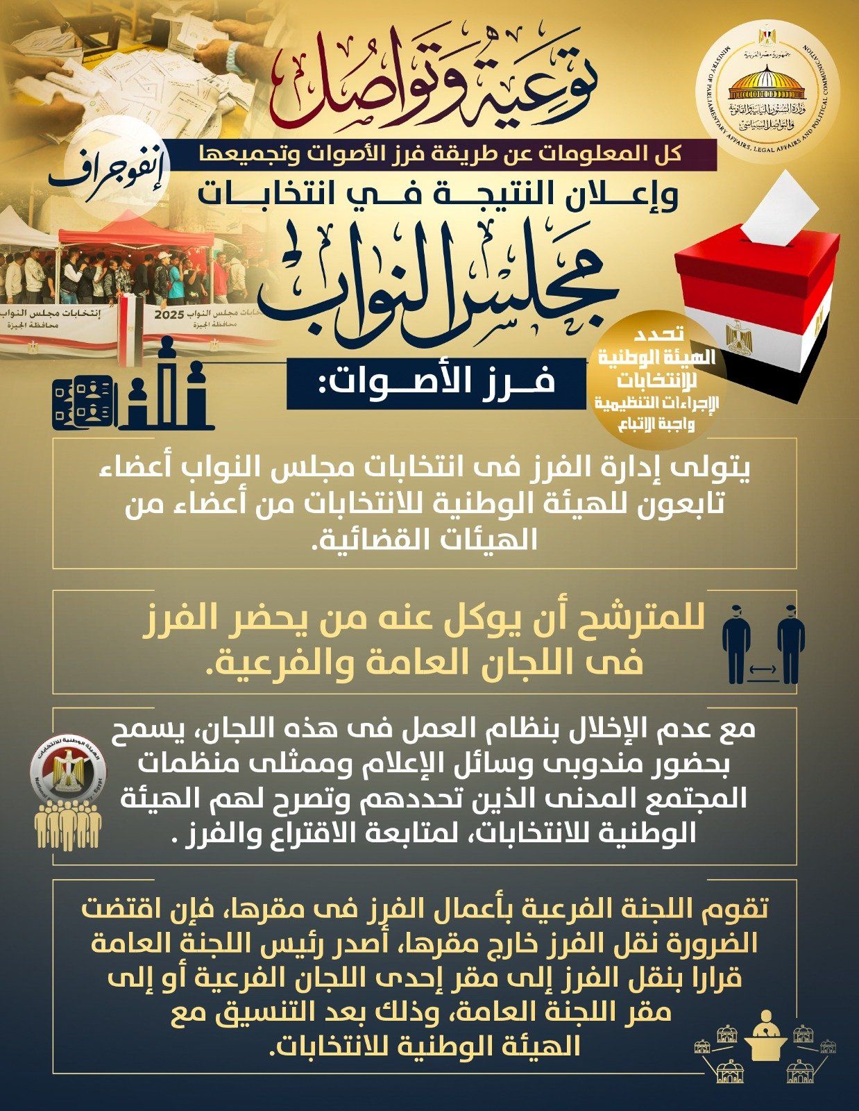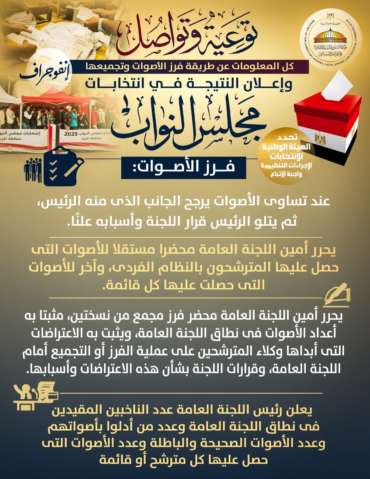إنفوجراف وزارة الشؤون النيابية.. 18 مرحلة من فرز الأصوات لإعلان انتخابات النواب
