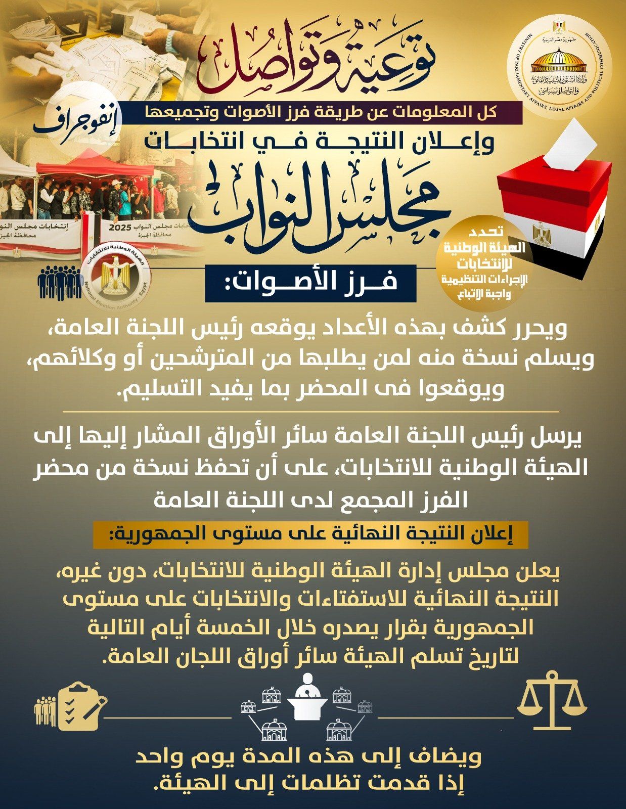 أصدرت وزارة الشؤون النيابية والقانونية والتواصل السياسي بيانًا اليوم الثلاثاء 11 نوفمبر 2025، قالت فيه إنه استمرارًا لسلسلة المحتوى التوعوي الذي بدأته الوزارة تحت شعار "توعية وتواصل"، نشرت اليوم مجموعة إنفوجرافات سياسية توعوية قدمت فيها معلومات بشأن كل ما يتعلق بعمليات فرز الأصوات، وذلك بالتزامن مع بدء اليوم الثاني والأخير في انتخابات المرحلة الأولى، لمجلس النواب 2025.