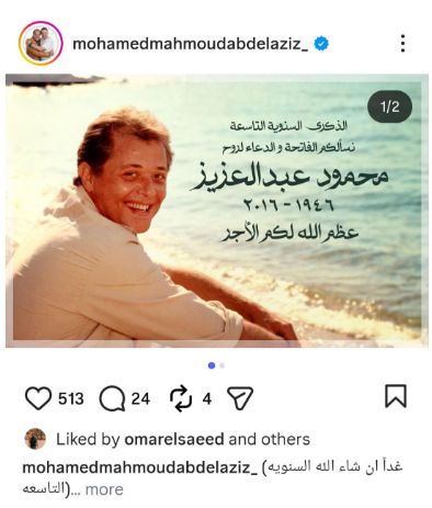 وكتب كريم محمود عبد العزيز على الصورة قائلا: الله يرحمك يا أبو الرجولة كلها، الجدعنة والحنية والطيبة والكرم، أبويا وأخويا وصديقي وابني عايشين بسيرتك العظيمة، لحد ما نموت، كما حرص شقيقة محمد على نفس صورة عبر حسابه وكتب: غداً إن شاء الله السنوية التاسعة.