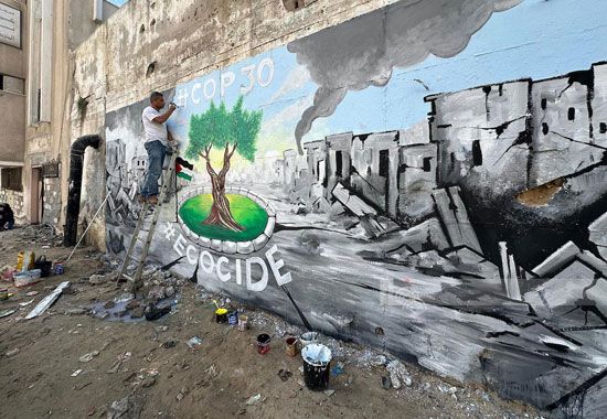 جدارية فلسطينية تستعد للعرض في قمة المناخ بالبرازيل