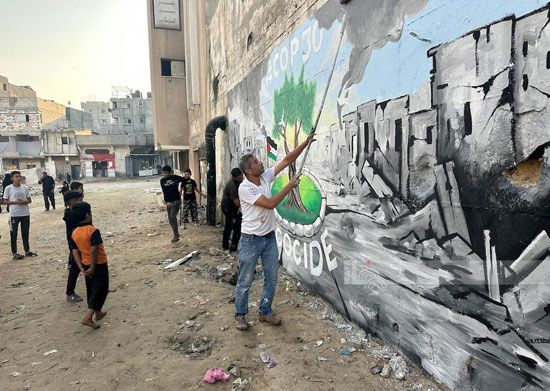 الأربعاء، 12 نوفمبر 2025 06:00 صبين أنقاض المنازل المدمّرة في مدينة خان يونس جنوب قطاع غزة، يختار مجموعة من الفنانين الفلسطينيين الألوان والفرشاة ليحكوا قصة صمودهم للعالم. فوق جدرانٍ انهارت بفعل القصف، يرسمون جدارية تعبّر عن الألم والأمل، عن البيئة التي تتنفس رماد الحرب، وعن الإنسان الذي يزرع الحياة رغم الخراب.