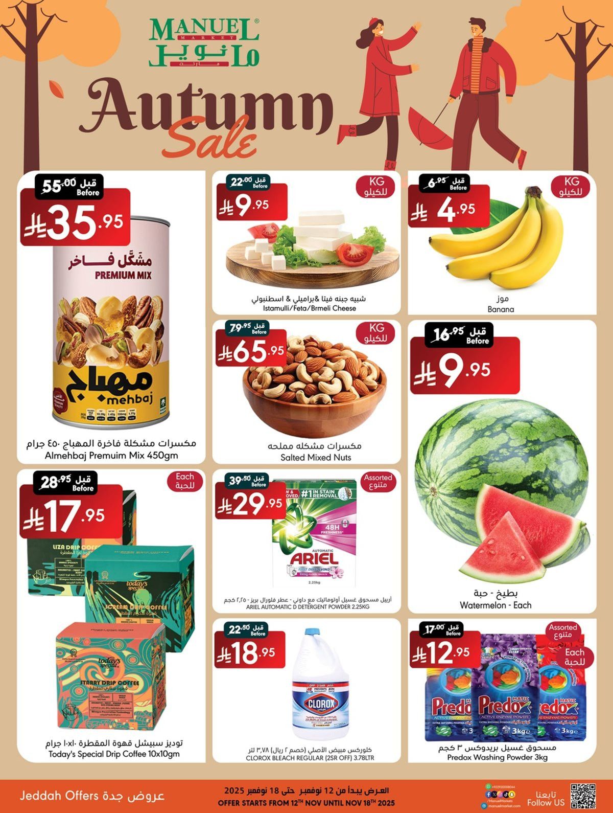 عروض مانويل جدة الأسبوعية الأربعاء 12-11-2025 تبدأ بتشكيلة من الأجبان والفواكه الطازجة والخضروات والمعلبات والعسل الأبيض والحبوب والبهارات والزيوت ثم تقدم خصومات على الأجهزة المنزلية مثل أفران التحميص وأجهزة التسخين ومكانس التنظيف بالبخار وأجهزة الطبخ ومبردات الهواء المحمولة باسعار مناسبة للجميع