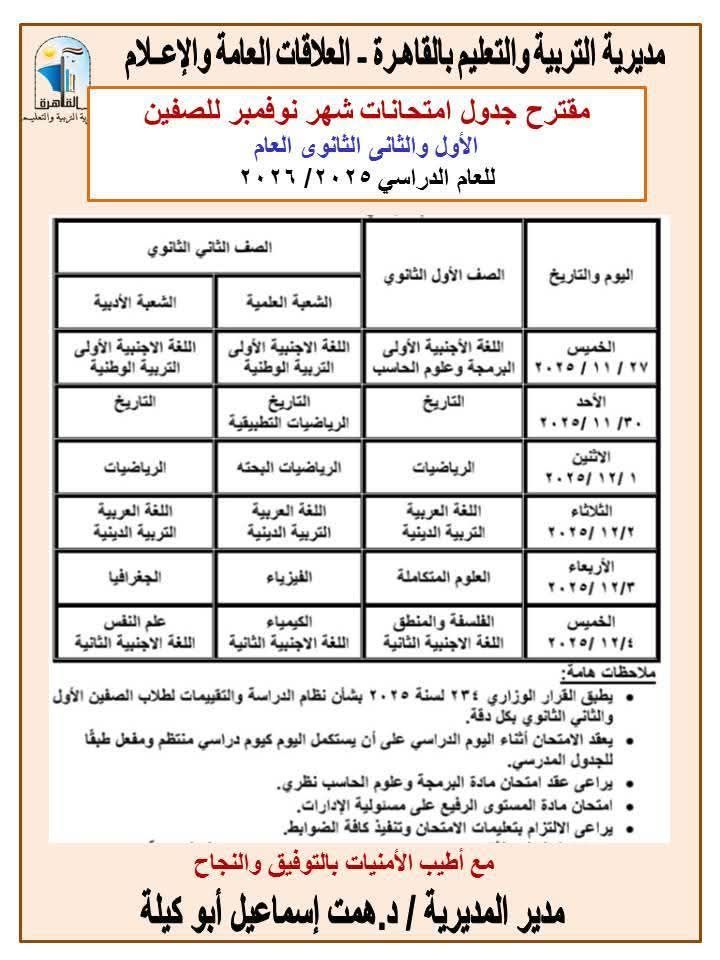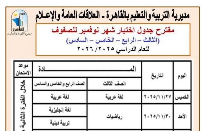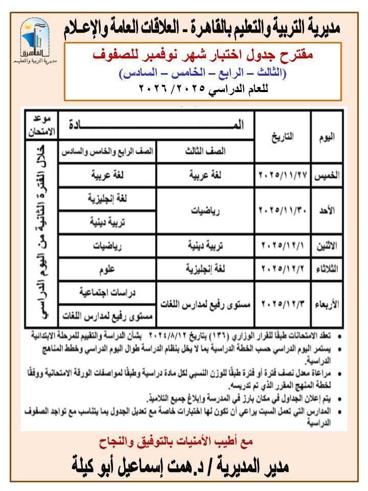 أعلنت مديرية التربية والتعليم بالقاهرة، برعاية الدكتورة همت إسماعيل أبو كيلة، عن مقترح جداول امتحانات شهر نوفمبر لمراحل النقل الثلاث (الابتدائي – الإعدادي – الثانوي) للعام الدراسي 2025 / 2026.