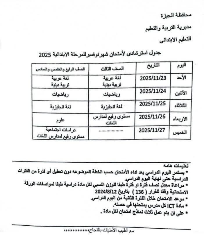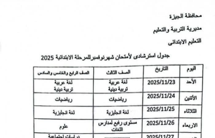 أعلنت مديرية التربية والتعليم بالجيزة جداول اختبارات شهر نوفمبر لصفوف النقل في المراحل الابتدائية والإعدادية والثانوية، على أن تبدأ الامتحانات يوم الأحد 23 نوفمبر 2025 بجميع مدارس المحافظة.