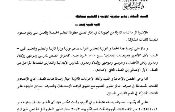 وأكدت الوزارة في خطاب رسمي موجه إلى المديريات التعليمية، أنه يأتي هذا الإجراء في إطار جهود الدولة لتطبيق منظومة التعليم الجديدة ورفع مستوى المعيشة للفئات المشاركة في تنفيذها، وبناءً على توصية لجنة الخطة والموازنة بمجلس النواب بدعم موازنة وزارة التربية والتعليم والتعليم الفني – الباب الأول الأجور وتعويضات العاملين – بمبلغ 500 مليون جنيه.