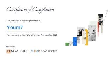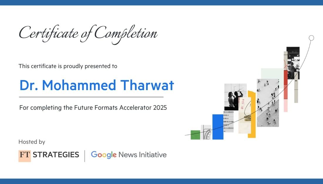 وتؤكد الشهادة التى حصل عليها فريق اليوم السابع على التزام المؤسسة بالاستثمار فى تقنيات المستقبل، خاصة فيما يتعلق بتسريع تبنى تقنيات الذكاء الاصطناعى (AI): لتعزيز كفاءة غرفة الأخبار، وتحليل بيانات الجمهور، وتخصيص تجربة المستخدم، وإتقان الأشكال الناشئة عبر تطوير أطر عمل عملية لإنتاج محتوى مبتكر فى منصات البودكاست، والفيديو العمودي، والرسائل الإخبارية المتخصصة.