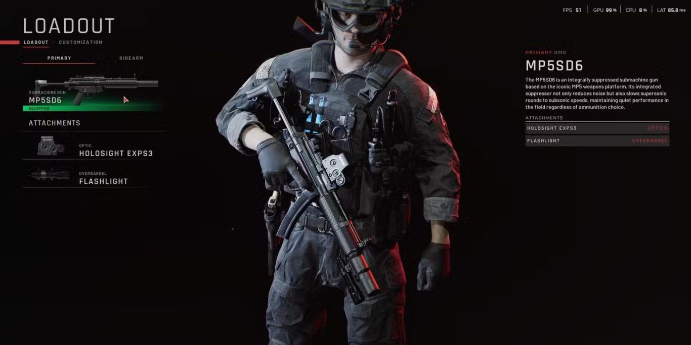 تستند MP5SD6 إلى نفس القاعدة الكلاسيكية لبندقية MP5 الشهيرة لكنها تأتي بإصدار خاص مزود بكاتم صوت مدمج بشكل افتراضي وهذا هو السبب في كونها أكثر هدوءا بشكل ملحوظ مقارنة بالأسلحة الأخرى حتى تلك التي تحتوي على كواتم صوت خارجية مثبتة على الفوهة فصوتها منخفض للغاية يجعلها السلاح الأمثل للاعبين الذين يفضلون العمل الفردي أو تنفيذ المهمات بسرية تامة دون لفت الانتباه.