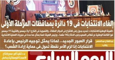 ـ إلغاء الانتخابات فى 19 دائرة بمحافظات المرحلة الأولى.. الهيئة الوطنية للانتخابات: تحديد جدول زمنى للاقتراع فى الدوائر الملغاة.. والتصويت فى الخارج 1 و2 ديسمبر والنتيجة 11 ديسمبر.. فوز القائمة الوطنية عن قطاعى الصعيد وغرب الدلتا بـ142 مقعدا.. ورئيس الهيئة: لسنا بمنأى عما حدث فى مجريات العملية الانتخابيةـ بدء تنفيذ أكبر مجمع لإنتاج الأسمدة الفوسفاتية وحامض الفوسفوريك فى مصر والشرق الأوسط بالوادى الجديد