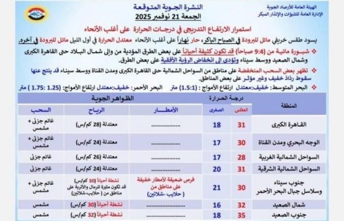 كشفتِ الهيئة العامة للأرصاد الجوية عن حالة الطقس اليوم الجمعة 21 نوفمبر 2025، موضحةً الظواهر الجوية ودرجات الحرارة المتوقعة في محافظات ومدن مصر.