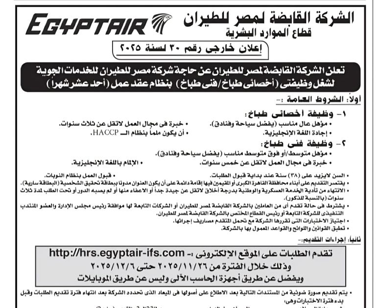 تعلن شركة مصر للطيران القابضة عن حاجتها لشركة مصر للطيران للطيران للتعاقد مع حديثي التخرج للعمل بمحطات مطار