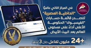 الأحد، 23 نوفمبر 2025 01:38 محققت الصفحة الرسمية لوزارة الداخلية على موقع فيسبوك إنجازًا عالميًا، حيث احتلت المركز الثاني ضمن الحسابات الحكومية الأعلى أداءً على المنصة، وفقًا لتقرير حديث صادر عن مركز معلومات مجلس الوزراء.