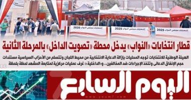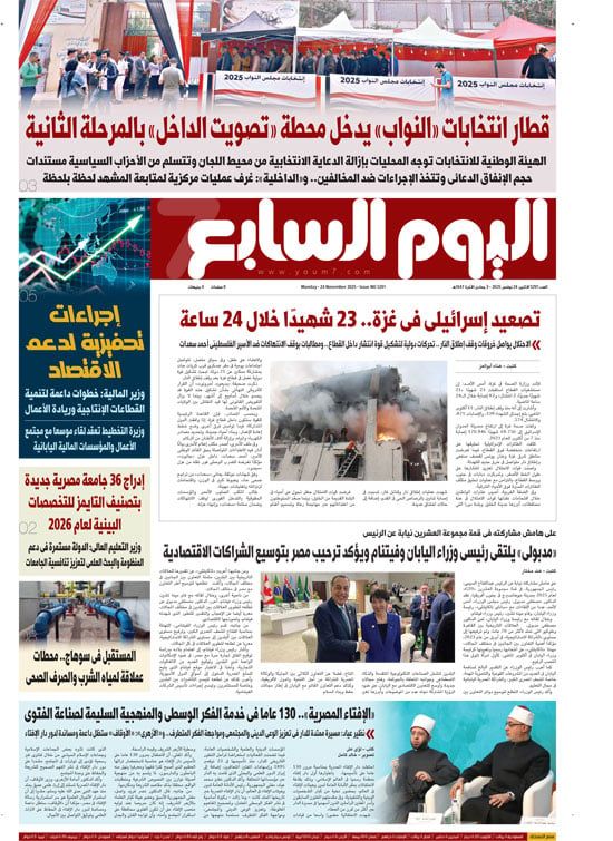 تناول عدد اليوم السابع المطبوع الصادر صباح غد، عددا من الملفات والتغطيات الإخبارية الهامة، كان أبرزها: قطار انتخابات النواب يدخل محطة تصويت الداخل بالمرحلة الثانية.. تصعيد إسرائيلى فى غزة و23 شهيدا خلال 24 ساعة.